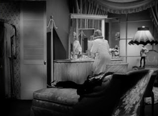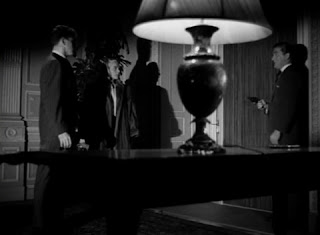 -En la reunión con la banda, Haskin usará planos cerrados, primeros planos con miradas cómplices o preocupadas, con Frankie y Kay de protagonistas, para enfatizar esos sentimientos. Ocasionalmente abrirá los encuadres para incluir a otros personajes, miembros de la banda, pero manteniendo el vínculo de la mirada en la pareja. Buenos detalles de dirección. En esta misma escena, Haskin usará un mueble en primer plano, ese recurso subrayado de colocar algún elemento del decorado en primer plano del encuadre, un mueble donde se colocará una amenazante arma y un pañuelo, perfectos elementos para plantear la tensión con lo que está por venir. Estamos de lleno en el segundo acto.