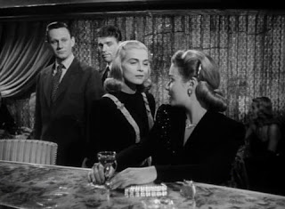 Dan (Mike Mazurki), es el portero del club, fiel esbirro de Dink. Kay Lawrence (Lizabeth Scott), es la chica de la función, novia de Dink, presentada por sus manos en el piano con Frankie entrando en cuadro, lo que supone un futuro vínculo. Ella es una rubia gatita, traviesa y coqueta, a la que veremos acicalarse ante un espejo, retocándose el carmín tras besar a Dink, que hará lo propio ante otro espejo para comprobar que no tiene manchas. Es el retrato perfecto de la falsedad de esa relación. Kay parece enamorada hasta las trancas de Dink… Le tiemblan las manos cada vez que va a verle… o quizá sea mitad amor mitad miedo. Lo que queda claro es que conoce o intuye sus mentiras y engaños, su forma de ser. No confía en él.