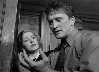 La escena de la confesión entre Douglas y su mujer, una magnífica Eleanor Parker que es de lo mejor y más destacado de la película, nos deja intensos momentos emocionales. Wyler situará la cámara sobre Douglas, de pie, ante su sentada mujer, minimizándola, mostrando su dignidad. Momentos y diálogos duros. Esa planificación, con Douglas en un estado de superioridad moral, de mayor dignidad, varía cuando llama “golfa” a su mujer, en ese momento Wyler volverá a situar a cámara y actores en una posición de igualdad, la superioridad de Douglas desaparece.