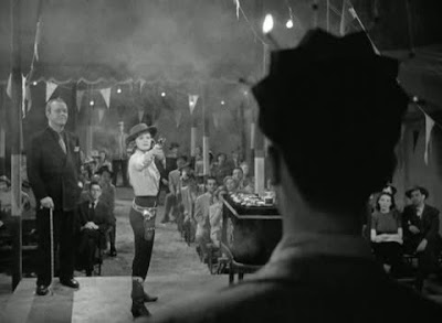 Probablemente ninguna otra película de Lewis contenga tal dosis de talento, de creatividad, de perfección técnica, de arrebatada pasión y locura enfermiza, aunque haya otros títulos del director que permiten afirmar que tampoco se trata de una mera casualidad la redondez de “Crazy gun”. Simplemente algo tan simple como la presentación de ambos personajes permite dibujar a la perfección su modo de ser, tanto la del niño juzgado como un adulto y que no ha cambiado demasiado cuando volvemos a verlo pasados los años y regresando a su ciudad tras abandonar su puesto como instructor de tiro en el ejército, cuya mayor diversión sigue siendo disparar, hacer blanco, tocas las armas, aunque ahora ya no tenga esa cara de avaricia, cercana a la lujuria cuando, como esa noche lluviosa, lanza una piedra contra un escaparate para robar la pistola que marca su destino posterior. Esa ansiedad juvenil por tocar el cañón de una pistola y sentirla propia se ha atemperado con los años ahora que puede comprar las armas que quiere, pero como pasión que es, encontrar a una mujer con la misma habilidad y dependencia supone todo un terremoto. En Laurie, con esa presentación circense, haciendo malabarismos de precisión vestida con unos ajustados pantalones de cowgirl que forman parte de su disfraz para debilitar a los hombres que se cruzan en su camino, hay otro brillo en los ojos, más peligroso, más audaz, más suicida. Son dos personas que tienen la misma obsesión y sólo un poco de tiempo es lo que se necesita para que el intercambio de miradas concluya en un intercambio que va más allá de lo amoroso, porque desde que Bart entra en la barraca de feria, su mirada a una mujer con pistola, como la de ella cuando siente el interés especial del hombre sobre su cuerpo proporciona un juego erótico donde el arma contiene un indudable simbolismo sexual no ocultado por un conjunto de creadores reunidos en una película completamente situada en el punto de mira del maccarthismo.