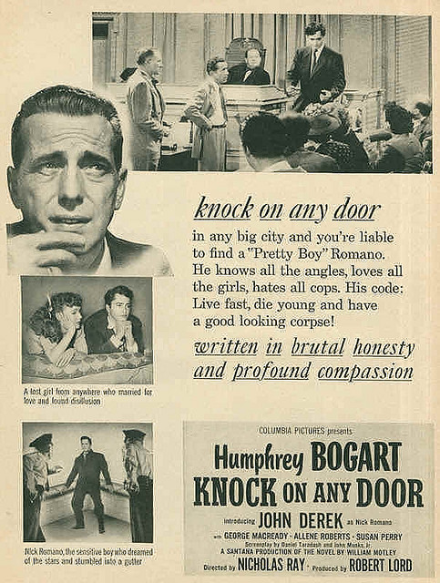 La película “Llamad a cualquier puerta”, puede atraer a muchos cinéfilos por varios motivos: La dirección de Nicholas Ray, el nombre de ese inmenso actor Humphrey Bogart, e incluso quizás por ver que tal trabaja John Derek. Durante su proyección puede que no llegue a fascinar, quizás por la poca profundidad con qué son tratados la mayoría de personajes del filme (en especial los femeninos). La verdadera cuestión que mueve la película, es saber si realmente la sociedad es culpable de las situaciones más duras en que puede encontrarse un joven salido de unos de esos barrios neoyorquinos, y a los que nadie presta atención, hasta su caída final.