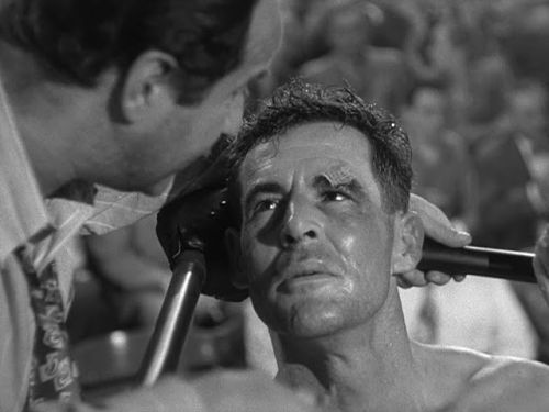Y llegamos a ese combate entre Stoker y Nelson (estupendo Hal Baylor). Es en esos fragmentos donde se da de la mano lo mejor y lo peor del film. Y es que las secuencias de la pelea deben ser consideradas, por derecho propio, entre las más crueles, veraces y al mismo tiempo documentales que jamás se han ofrecido en la pantalla –hay que recordar la reciente pelea brutal que Wise había introducido en el extraño western BLOOD ON THE MOON (1948)-. El hecho de ofrecerse a tiempo real y no obviar la brutalidad de los lances, además con unas angulaciones veraces y una luz blanquecina, otorga a esos fragmentos caracteres de excepción. Pero es en los mismos donde aparece esa tendencia a la obviedad y el subrayado, que tiene su límite máximo en esa señora que solo sabe decir matalo, matalo y de la que finalmente se muestra un horrible plano de su boca pronunciado esos improperios. Ciertamente, todo lo que la pelea en si es un alarde de dolorosa sinceridad, los planos de repercusión en el público de la pelea, dejan mucho que desear e incluso contradicen el espíritu de la misma.