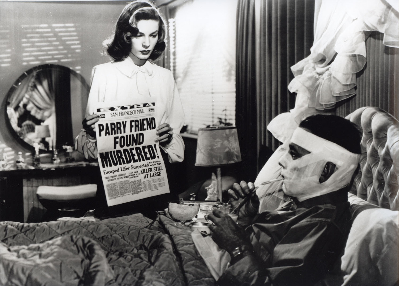 En los primeros compases de La senda tenebrosa asistimos a la huida de Parry de la prisión de San Quintín en el interior de uno de los barriles que porta un camión. Después de robar el coche a un tipo demasiado curioso –le somete a un incómodo interrogatorio– que le recoge, aparece de la nada una misteriosa mujer (Bacall, por supuesto) que le ofrece su ayuda y termina escondiéndole en su casa. Ella es Irene Jansen, una pintora que se ha sensibilizado con el caso de Parry, al que cree inocente, después de que su padre pasase por unas circunstancias similares, siendo también juzgado por el asesinato de su mujer, siendo inocente. La enigmática mirada felina de Lauren Bacall, así como su sensual voz y una poderosa presencia escénica propia de las mejores femme fatale, son explotadas como nunca en esta película en un personaje del que, además, tanto el protagonista como el espectador recelamos en todo momento de sus intenciones (¿en serio alguien puede llegar a incurrir en un delito por ayudar a un extraño sin que detrás exista algún tipo de interés?). Lo cierto es que la química entre la pareja funciona, como es de esperar, a las mil maravillas y su inevitable romance, lejos de entorpecer la trama criminal, está perfectamente introducida en la historia. El magnífico libreto, obra del propio Daves, da cancha a un puñado de interesantísimos personajes secundarios que se cruzan en el camino de Parry, no ya en su continua escapada de la policía, sino en su búsqueda por descubrir la identidad del verdadero asesino de su esposa. Todos ellos conforman una maraña de mentiras, traiciones y alguna que otra improvisada alianza, desde un taxista habituado a moverse en ambientes turbios y que pone en contacto al prófugo con un cirujano que transforma su rostro; un extorsionador (el hombre que le había recogido en la carretera, encarnado por un estupendo Clifton Young) que busca sacar rendimiento económico a su información y, sobre todo, Madge Rapf (una inmensa Agnes Moorehead), la mujer que testificó en contra de Parry en su juicio, sin duda, el personaje más maquiavélico de la función. Todas y cada una de estas personas están dibujadas en el guion de forma tan ambigua (incluso los roles de Bogart y Bacall que, siendo los buenos de la película, también se mueven en unos terrenos que bordean peligrosamente la ilegalidad cuando no caen directamente en ella) que se consigue el buscado efecto de que desconfiemos de todos ellos y no sepamos nunca, a ciencia cierta, en quién se puede confiar y en quién no.