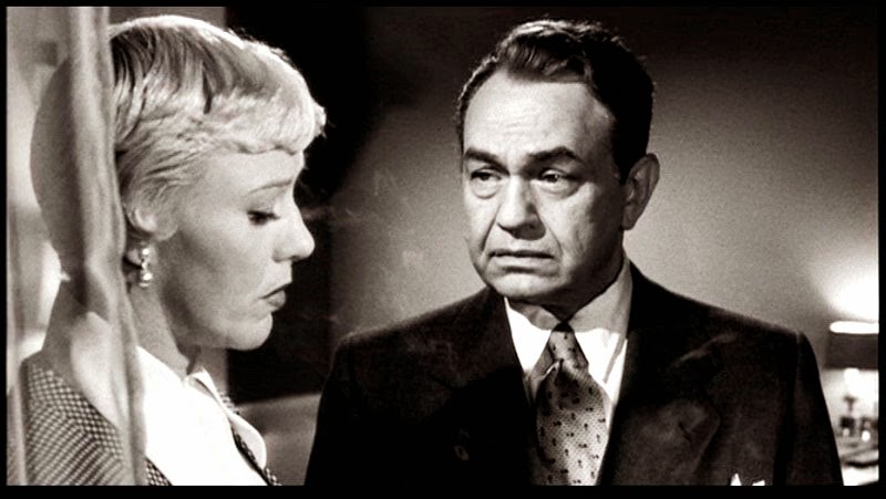 Este inicio del film que he relatado es lo mejor de la película de Karlson, la dureza de la fotografía en blanco y negro, la sequedad narrativa y el ambiente de las calles de la ciudad, reflejado con aire casi documental, es evidente que lleva su marca. Pero lamentablemente, a partir de ahí, lo que se nos ofrece es una especie de obra teatral, al parecer basada en una obra “Dead Pigeon” de un tal Leonard Kantor, con un interés más bien exiguo. Una vez eliminado el testigo que iba a declarar contra el hampón, al fiscal Hallett (un discreto Edward G. Robinson) sólo le queda el recurso de sustituir a aquél por una mujer que cumple condena en presidio: Sherry Conley (una Ginger Rogers en un gran papel alejada de sus trabajos habituales). La cuestión que plantea el film, y que resuelve recurriendo a un truco psicológico de una sencillez aplastante, es si la mujer estará dispuesta a declarar contra el hampón, ya que si lo hace pondrá en peligro su vida.