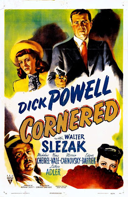 En 1945, Cornered Dick Powell interpreta a un hombre agotado, enojado y con pocas esperanzas para el futuro. Aunque está casi fatalmente empañado por su trama serpentina, Cornered vale la pena verlo, incluso es un importante cine negro. Ofrece una visión del mundo extraordinariamente sombría, precoz incluso para el noir, y ayudó a allanar el camino para la ola de películas neuróticas, cínicas y oscuras que definirían el período clásico de la posguerra.